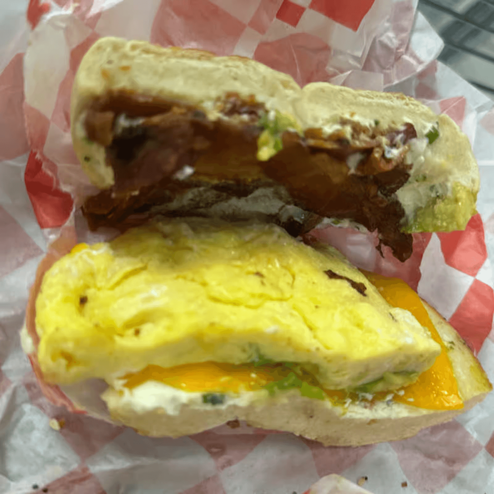 Toasted bagel with egg, cheese, bacon, jalapeño & avocado.