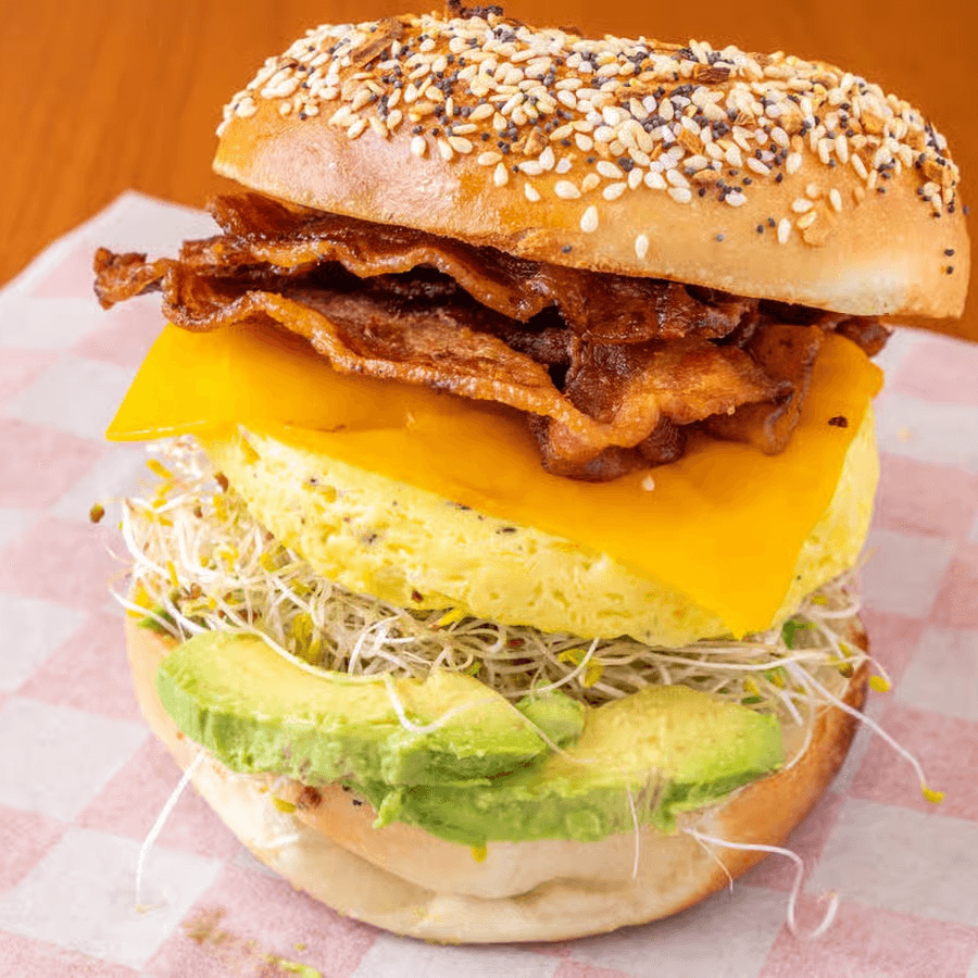 Toasted bagel with egg, cheese, lettuce, tomato, onion, sprouts, avocado, mayo & mustard.